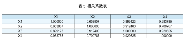 利用Eviews软件对多元线性回归模型中自变量冷水降温量(x1)、加冰量(x2)、一次风冷骨料降温量(x3)、二次风冷骨料降温量(x4)的相关系数进行分析,其结果如表5所示: