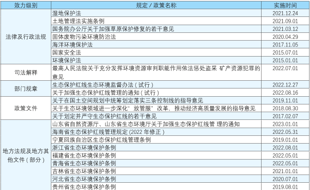 目前关于生态保护红线的相关法律法规及政策标准主要包括: