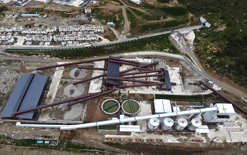 现场基础处理产生的生产废水通过三级沉淀池处理,用于现场洒水降尘、道路养护;生活污水经过污水一体化处理设备,也可用于洒水降尘、绿化区养护和浇花,实现废水和污水的循环利用和零排放。