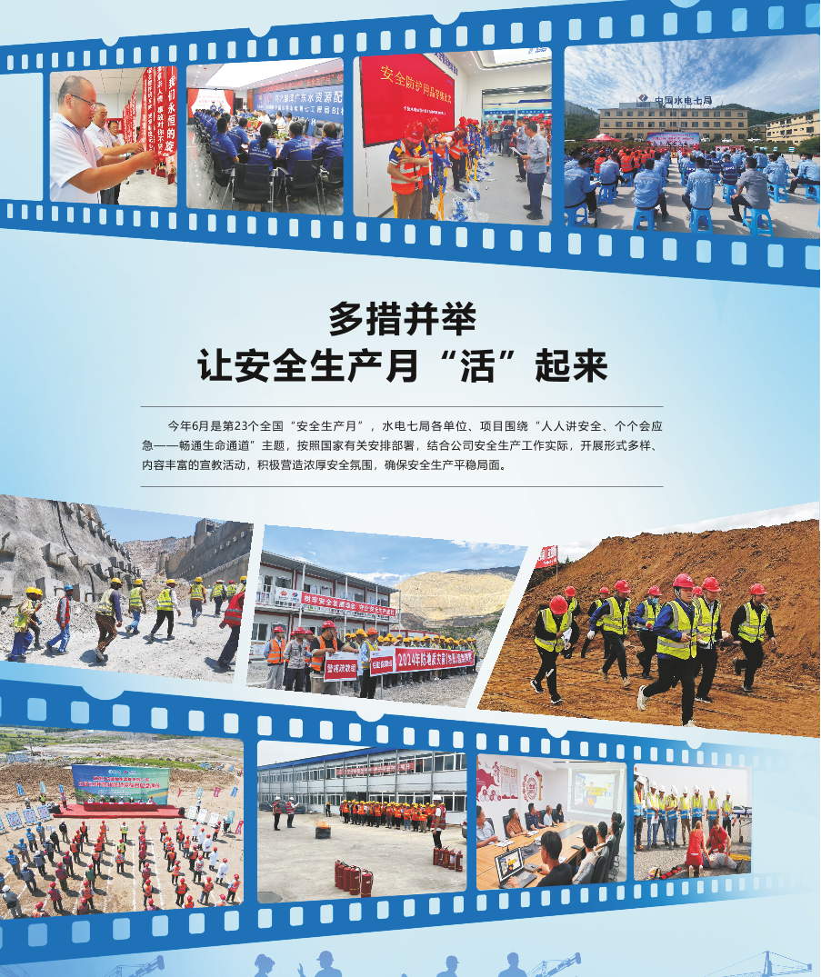 今年6月是第23个全国“安全生产月”,水电七局各单位、项目围绕“人人讲安全、个个会应急——畅通生命通道”主题,按照国家有关安排部署,结合公司安全生产工作实际,开展形式多样、内容丰富的宣教活动,积极营造浓厚安全氛围,确保安全生产平稳局面。