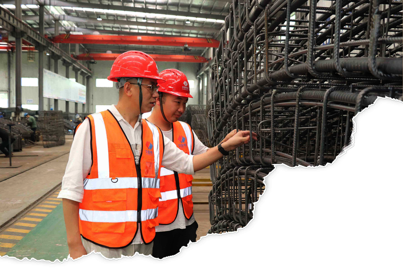 仇黎航(左)检查钢筋笼焊接质量 郎文韬