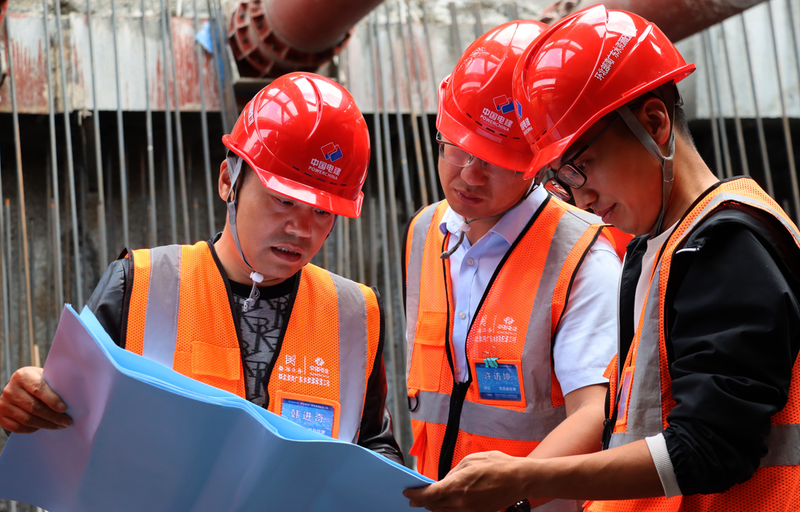 韩进奇(左一)在现场探讨技术方案 公司专业首席工程师、环北部湾B1标项目经理 韩进奇