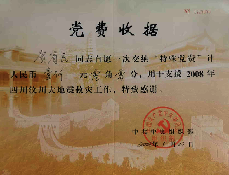 按照中国水电建设集团的指示,系统内直接持续向位于极重灾区的水电十局捐款捐物。按四川省政府救灾办、中国水电建设集团及西南代表处的要求,将中国水电建设系统内的捐赠物资接收后再转运至急需的救灾现场。抗震救灾期间,水电七局共向灾区捐款现金300多万元及大量救灾物资。这些捐款捐物既来自工程局,当然每次都要按有关规定研究捐赠的款项和物资清单;也有职工包括退休职工、家属的捐款捐物,我与大多数党员干部一样,在抗震救灾期间也多次捐款捐物。2008年5月23日,我自愿一次交纳“特殊党费”壹仟元,中共中央组织部还给我盖有鲜红印章的党费收据。