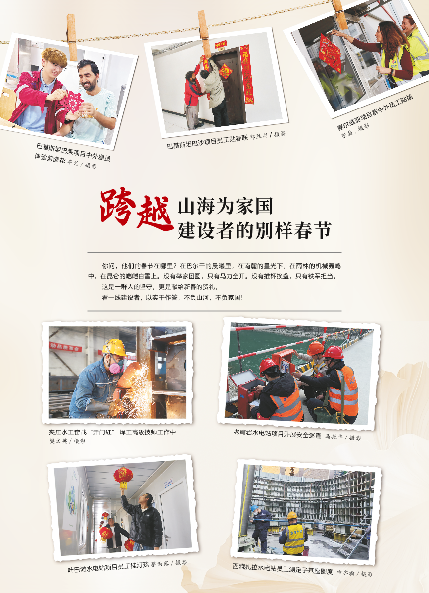 巴基斯坦巴莱项目中外雇员体验剪窗花 李艺 / 摄影巴基斯坦巴沙项目员工贴春联 邱胜刚 / 摄影塞尔维亚项目群中外员工贴福 张磊 / 摄影夹江水工奋战“开门红” 焊工高级技师工作中 樊文英 / 摄影老鹰岩水电站项目开展安全巡查 马振华 / 摄影叶巴滩水电站项目员工挂灯笼 蔡雨露 / 摄影西藏扎拉水电站员工测定子基座圆度 申齐瀚 / 摄影